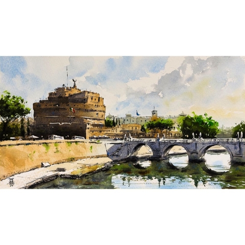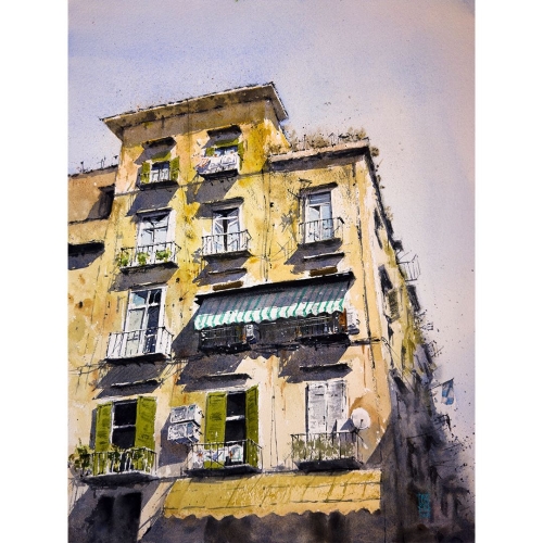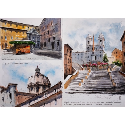 “In questo momento utilizzo principalmente l’acquerello, ma amo anche il disegno a china e a matita. Prediligo lavorare su carta di cotone, in formati medio o grandi, ma spesso dipingo anche su sketchbook, soprattutto en plein air. In passato mi sono dedicato molto al disegno digitale, in particolare con Procreate.”